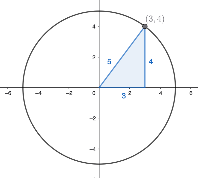 And there is more. You can imagine placing this triangle in a Cartesian coordinate system as shown below. Now draw a circle with centre at the point $(0,0)$ and with radius $5$: