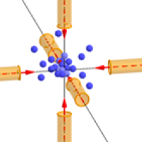Atoms being trapped and slowed in the "optical molasses" created by six laser beams.