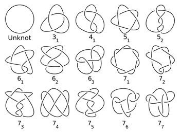 This image shows the so-called unknot (top left) as well as other prime knots which are defined by the number of crossings. Prime knots are knots that, in a certain sense, cannot be considered decomposable. Find out more about prime knots here.