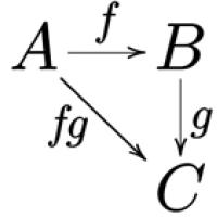 As is the way in mathematics, these morphisms have to adhere to some rules. There must be an identity morphism that takes each object to itself, for example the morphism $1_A: A\rightarrow A$ in the category illustrated below. And you can compose morphisms, so if there are two morphisms, $f$ that takes $A$ to $B$, and $g$ that takes $B$ to $C$, then there must be a third morphism $fg$ that takes $A$ to $C$.