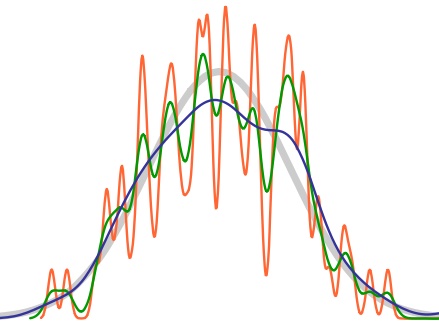 The shape of the Gaussian curve, shown in light grey, is defined by the first and second moments. As you vary these and the higher moments, you change the shape of the curves, shown in colour. (Image from M. W. Toes – CC BY-SA 4.0)