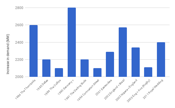 An example of this is an international football match when lots of people will not only turn on their TV sets to watch the match, but will also turn on their kettles at half time, or just after the match finishes. In the figure below we can see the demands on the UK supply by some notable football matches in some recent years. Top of the list was the famous World Cup semi final of England against West Germany, which went to penalties, but was ultimately lost by England. This match is famous for two things. Firstly, Paul Gascoigne's tears when he received a booking. And secondly for nearly shutting down the UK electricity supply network. Indeed the total change in the demand for electricity during the match was 2.8 GW, which was 11% of the total power delivered by the network and amounted to about 2 million kettles.