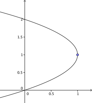 Usually a quadratic equation is written as $$ ax^2+bx+c=0 $$ and we want to find the solution $x$. When we meet the equation at school we are told that it may have one, two or no real solutions. These are given by the famous formula $$ x=\frac{-b\pm \sqrt{b^2-4ac}}{2a}. $$ This formula says that the quadratic equation has two real solutions if $b^2> 4ac$ and no real solutions if $b^2 4ac$. To illustrate this we will look at an equation for which $a = 1$, $b = -2$. The two solutions are then given by $$ x=1\pm \sqrt{1-c}. $$ There are two real solutions if $c 1$ and no real solutions if $c> 1$. A graph of the two solutions is given below, with the special point $c = 1$, $x = 1$ (where there is only one solution) highlighted.