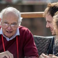 Sir Michael Atiyah talking to young researchers at the Heidelberg Laureate Forum 2017. Photo © Christian Flemming/HLF.