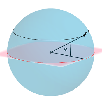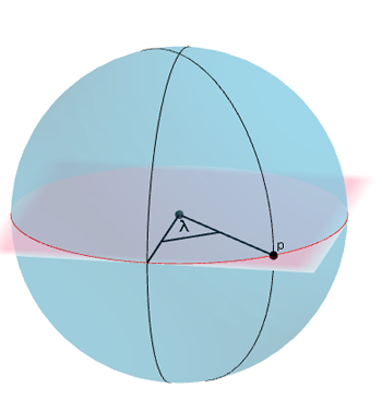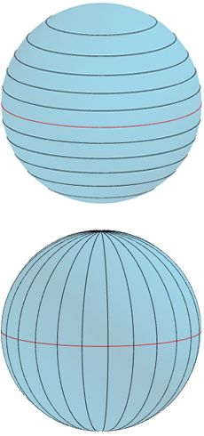 Navigation around the spherical Earth uses the same idea, only here the grid isn't formed by straight lines but by circles that lie on the surface of the Earth. One set of circles (which we can think of as horizontal) comes from planes that are perpendicular to the rotation axis of the Earth. These slice right through the Earth, meeting its surface in circles which are called lines of latitude. The radii of these circles vary: the largest one is the equator, which chops the Earth neatly into a Northern and Southern hemisphere. As you move North or South the circles become smaller, and at the poles they are just points.