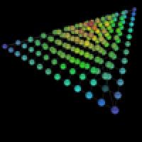 Four-note chords in geometrical music theory — the collections of notes form a tetrahedron, with the colours indicating the spacing between the individual notes in a sequence. In the blue spheres, the notes are clustered; in the warmer colours, they are farther apart. The red ball at the top of the pyramid is the diminished seventh chord. Near it are all the most familiar chords of Western music. Photo courtesy Dmitri Tymoczko.