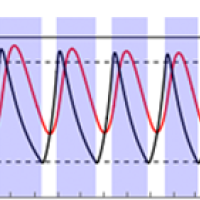These graphs show the prevalence of the virus (black curves) and critical cases (red curves) under intermittent social distancing (shaded blue regions). The first and third graphs are without seasonal forcing; the second and fourth with seasonal forcing. Critical care capacity is depicted by the solid horizontal black bars; the first two graphs are the scenarios with current US critical care capacity and the third and fourth graphs are the scenarios with double the current critical care capacity. The maximal value of the basic reproduction number is 2 in wintertime, and for the seasonal scenarios it is 1.4 in summertime. The figure is from the paper Social distancing strategies for curbing the COVID-19 epidemic by Kissler et al. Used by permission.
