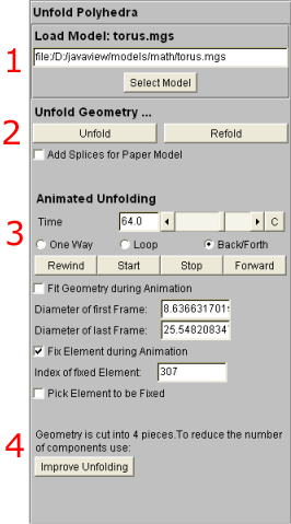 Press the Unfold button to unfold the geometry. The Refold button restores the original vertex coordinates (but leaves the geometry cut open). Activate the Add Splices for Paper Model and unfold the model, to create splices that help to build a paper model, see figure bottom right.