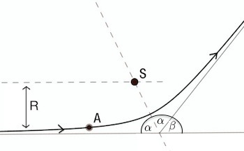 Note that the mass of the asteroid does not influence its trajectory. The deflection angle $\beta$ is the same for all bodies with the same values for $R$ and $V$. If light is endowed with mass, as Newton thought, we set $V = c$, the speed of light, and obtain the bending angle for a ray of light: $$ \beta = \frac{2 G M}{R c^2} . $$ Assuming that the light ray passes close to the Sun, we take $R$ to be the solar radius. Using values (all in SI units) for the universal constant of gravitation $G = 6.67 \times 10^{-11}$, the solar mass $M = 2 \times 10^{30}$, solar radius $R = 7 \times 10^8$ and the speed of light $c = 3 \times 10^8$, this gives $$ \beta \approx 0.423 \times 10^{-5} \mbox{radians} = 0.87 \mbox{arc seconds} $$ So Newton's theory of gravity predicts that the path of a light ray passing close to the Sun will be bent by an angle of 0.87 arc seconds.
