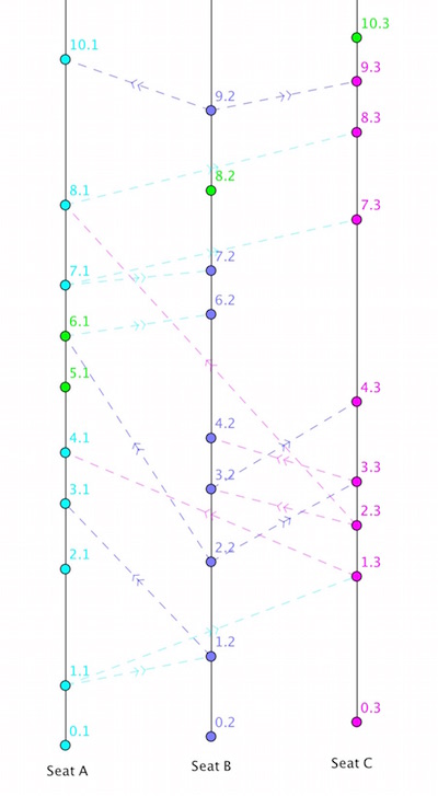 - For any two seats $S_i$ and $S_j$, the messages from $S_i$ to $S_j$ are received in the order they are sent, and every message sent will eventually be received. (You could make sure of this by introducing message numbers and acknowledgement protocols – but we're keeping it simple here by making this assumption).