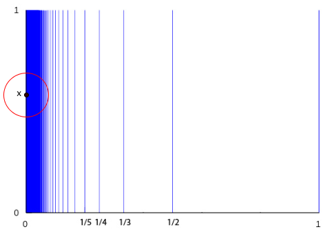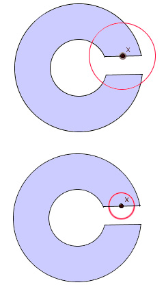 local connectivity, or rather a lack of it. To understand local connectivity, first think of a comparatively simple shape, like the one in the picture on the left (call it $S$). Pick a point $x$ that's part of $S$ — for illustration we'll pick one that lies on its outline. Now draw a little disc $V$ with $x$ at its centre and look at the intersection of $S$ and $V.$