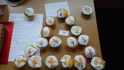 Speaking of cake, this year also saw some superb entries for the MathsJam Bake-off, a competition with prizes for most delicious cake, most attractive cake, and best mathematical concept demonstrated through cake. Colin Beveridge had the brilliant idea of making fairy cakes and icing them with the Farey sequence, and I was only too happy to lend my baking skills to make some buns to carry out his plan.