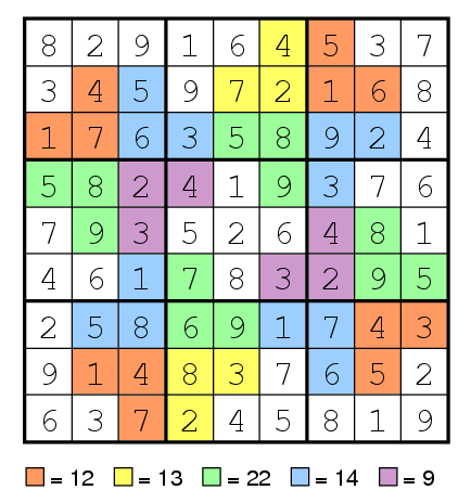 Fill in the grid so that each row, column, and block contain the numbers 1-9 exactly once, and so that there are no repeated entries in any connected shaded region. In addition, all shaded regions of a given color add to the same sum; for example, if one red shaded region has entries that sum to 21, then all red shaded regions in that puzzle sum to 21. The sums are not given; you must determine them yourself.