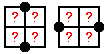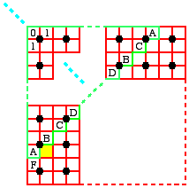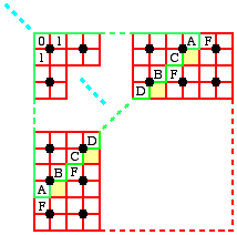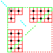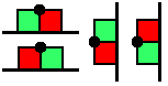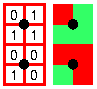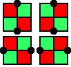 (2') Of the four unit squares between two arbitrary (vertical or horizontal) neighbouring grid points, two are red (=0), and two are green (=1) (this means that situations like the ones shown on the right are admitted too).