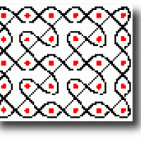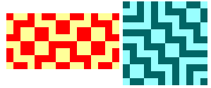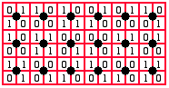 Examining the example described above, you can see that in each column and row the 0's and 1's are in balance. This implies also that the total number of 0's in the matrix is equal to the total number of 1's. This is a general property of a Liki-design: the two colours are in balance. As well as this global symmetry, there are local symmetries of two types: