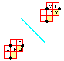 Now consider pairs of consecutive unit squares located between diagonally neighbouring grid points along this oblique row. Let us take any pair and let P and Q be the numbers inscribed in them. On the other side of the axis there exists a corresponding pair, shown to the right. Let S and T be the numbers inscribed in them. What can be said about their neighbouring numbers that belong to the expanded triangular array?