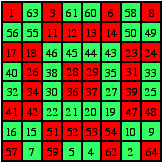 The set of numbers written inside the green unit squares is rotated through 180o about the centre of the Liki-design. The resulting number square is a magic square, as the sum of the numbers in any row or column, (or along the principal diagonal) is equal to 260.