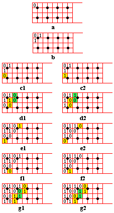 Consider the open grid rectangle in labelled (a), with a 0 in the top left corner. By the first symmetry rule, both the horizontal and vertical neighbour unit squares have to contain a 1, as shown in (b). There are too few numbers filled in for us to be able to apply either of the construction rules. So we are free to choose the first number in the third row to be either 0 or 1. These two possibilities are labelled (c).