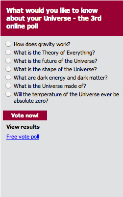 The most popular questions in polls far were was What happened before the Big Bang? and Are the constants of nature really constant?. Read the answers by clicking on the links, and discuss them on our blog.