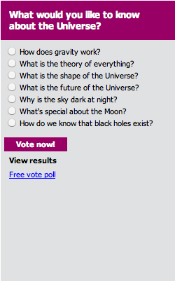 This is the fourth online poll in our series to celebrate the International Year of Astronomy 2009. Choose your favourite question from the list on the right, and we'll put the one that proves most popular to world-leading astronomers and cosmologists, including Astronomer Royal Martin Rees and author and cosmologist John D. Barrow. The poll will remain open for a month and the answer will be published in a Plus article and podcast soon after. If your most burning question is not on this list, then leave a comment on this blog and we'll endeavour to include it in a future poll — there will be three more polls dotted throughout the year.