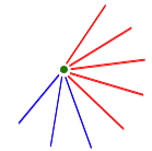 If the graph has only 9 points, each has only 8 neighbours. How can our theorem fail? Only if every point has exactly five red lines and three blue ones. That is, every point must look like this: