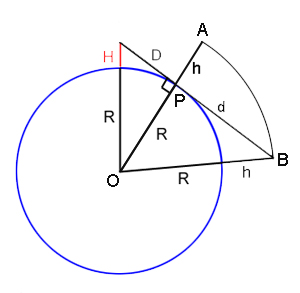 Now let $d$ be the distance from $P$ to $B$. Using Pythagoras' theorem on the right-angled triangle $OPB$, we get $$d^2+R^2=(R+h)^2.$$ Noting that $R > > h$, so that we can ignore the $h^2$ term, we have $$d \approx \sqrt{2Rh}.$$ Now the maximum distance to the object from the observer is approximately equal to $$D+d=\sqrt{2HR}+\sqrt{2Rh}.$$ Using $D=\sqrt{2RH}=4800m$, $R=6400km,$and $h=2km$ we get that the maximum distance to the object is approximately $164.8km.$