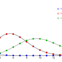 The Poisson distribution for a=1 (blue), a=6 (red), and a=10 (green).