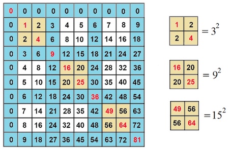 In the Plus article Triangular number patterns, the authors unveiled that the multiplication table also gives us triangular numbers (numbers that can be represented by a pattern of dots arranged into an equilateral triangle). Summing up the numbers in each square lattice starting in row 1 and column 1, gives us the triangular numbers squared.