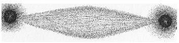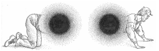 Time machine self destruction: As the right wormhole flies back toward the left, at the end of its twins-paradox trip, vacuum fluctuations flow through the wormhole then out through the space between them, returning to their starting point at the moment they left. Their gravitating energy grows extremely large, and perhaps destroys the wormhole at the moment it becomes a time machine. (Figure adapted from my book Black Holes and Time Warps, [4].)