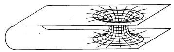 ![]() Wormhole held open by Casimir Vacuum: Two concentric spherical conducting plates are placed at the throat of a wormhole, with a tiny separation. (One dimension is suppressed here, so our Universe is a 2-dimensional sheet and the plates look like circles rather than spheres.) If the plates' energies (including their mass's energy E=mc2) are small enough, then the repulsive gravity due to the Casimir vacuum between the plates can hold the wormhole open. |