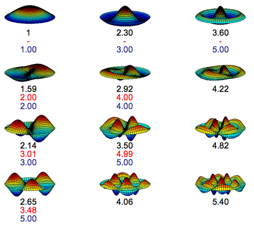 Figure 7: A set of mode shapes for the drum. The numbers give the frequency ratios (where available) for the ideal membrane (in black), the kettle drum (in red) and the tabla (in blue).